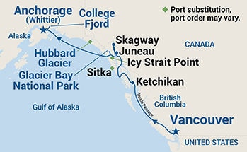 Vancouver, Ketchikan, Juneau, Skagway, Glacier Bay National Park (scenic cruising), College Fjord (scenic cruising), Whittier (Anchorage)