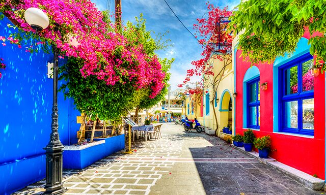 While Kos is full of reminders of classical Greece, and of the Knights of St. John and their impressive fortress, it’s also a colorful town clad in palm-lined walks, white colonnaded houses and red hibiscus.