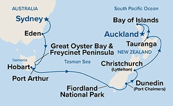 Sydney, Eden, Great Oyster Bay & Freycinet Peninsula Scenic Cruising, Port Arthur, Hobart (Overnight), Cruise Fiordland National Park, Port Chalmers, Napier, Tauranga, Bay of Islands, Auckland