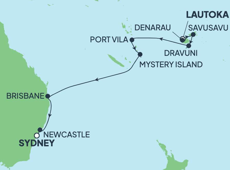 Lautoka, Denarau, Savusavu, Dravuni, Port Vila, Mystery Island, Brisbane, Newcastle, Sydney.