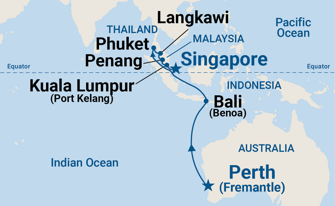 Perth (Fremantle) → At Sea → At Sea → At Sea → Bali (Overnight) → At Sea → At Sea → At Sea → Phuket → Penang → Kuala Lumpur (Port Kelang) → Singapore